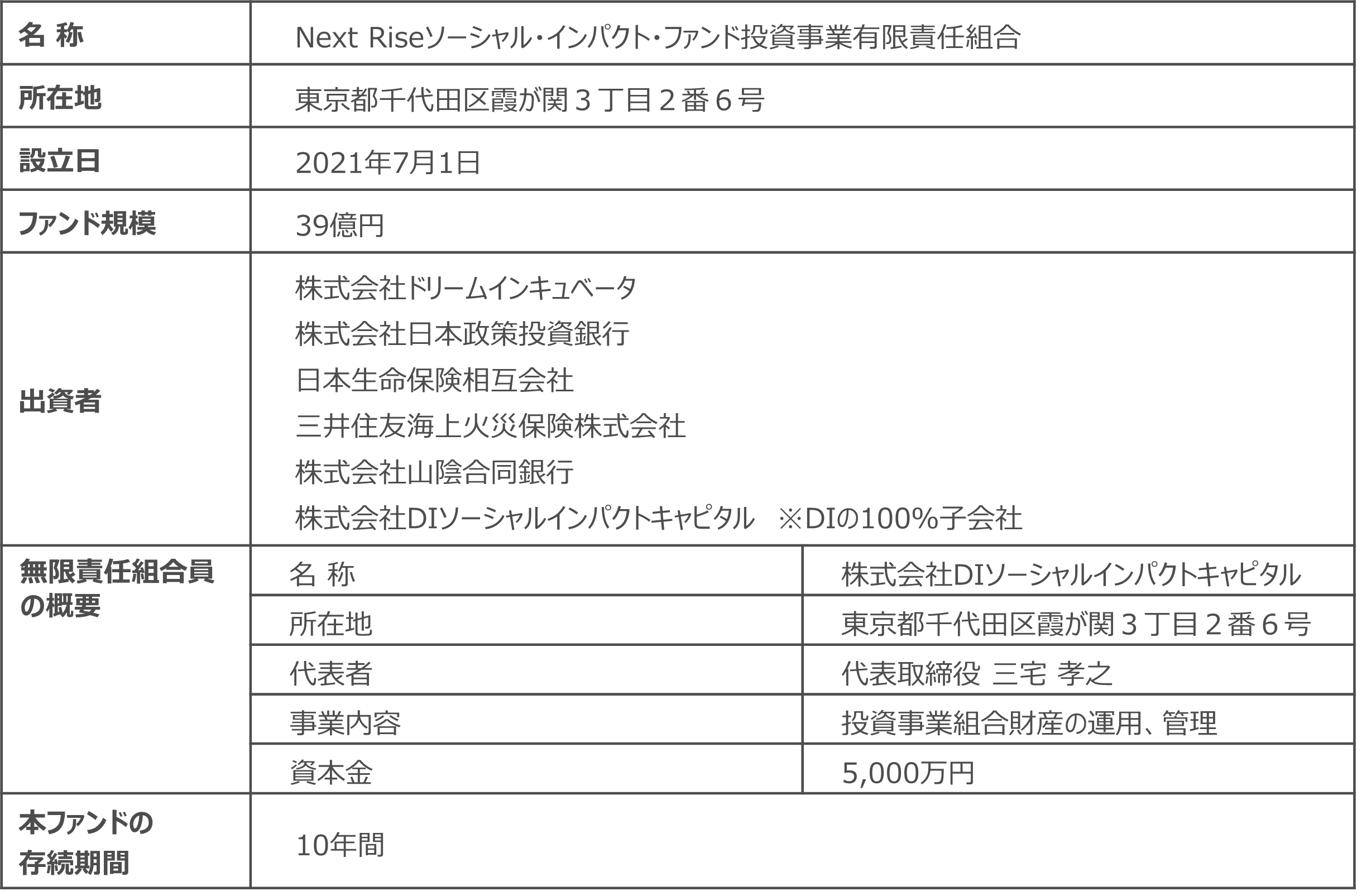 株式会社ドリームインキュベータ(東京都千代田区、代表取締役社長 三宅孝之、以下「DI」)が運営するSIBファンド「Next Rise ソーシャル・インパクト・ファンド投資事業有限責任組合」(以下、「本ファンド」)に対し、株式会社山陰合同銀行(島根県松江市、取締役頭取 山崎徹)と出資契約を締結したことをお知らせいたします。