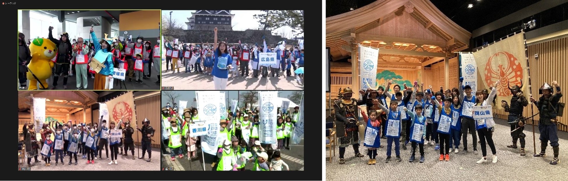 4県の会場は別々でしたが、出陣式と帰陣式ではオンライン中継で全会場をつなぎ連動しました。各地域にはそれぞれ、歴史や地理、産業、人口など特徴があり、海洋ごみ対策もそれぞれに合う取り組みを進める必要があります。自分が生活する地域の特色を知り、隣り合う地域の話を聞き、お互いの違いや共通する課題を認識するとともに、同じように瀬戸内海を大事に思う仲間がたくさんいることを感じられるイベントとなりました。また当日は各地で、甲冑をまとったごみ拾い武士や、鉄砲隊、ご当地キャラなども参上し、ホラガイの合図で一斉にごみ拾いに出陣しました!