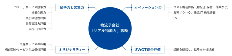 当社は上場・非上場企業を問わず過去数十社に亘る物流子会社に対して、事業デューデリジェンス・戦略策定・組織改革・業務改善を支援してきた実績を活かし、「競争力と営業力」「オペレーション力」「オリジナリティ」「SWOT総合評価」の4つの評価軸に基づく、物流子会社の「リアル物流力」を診断・評価を行っています。
