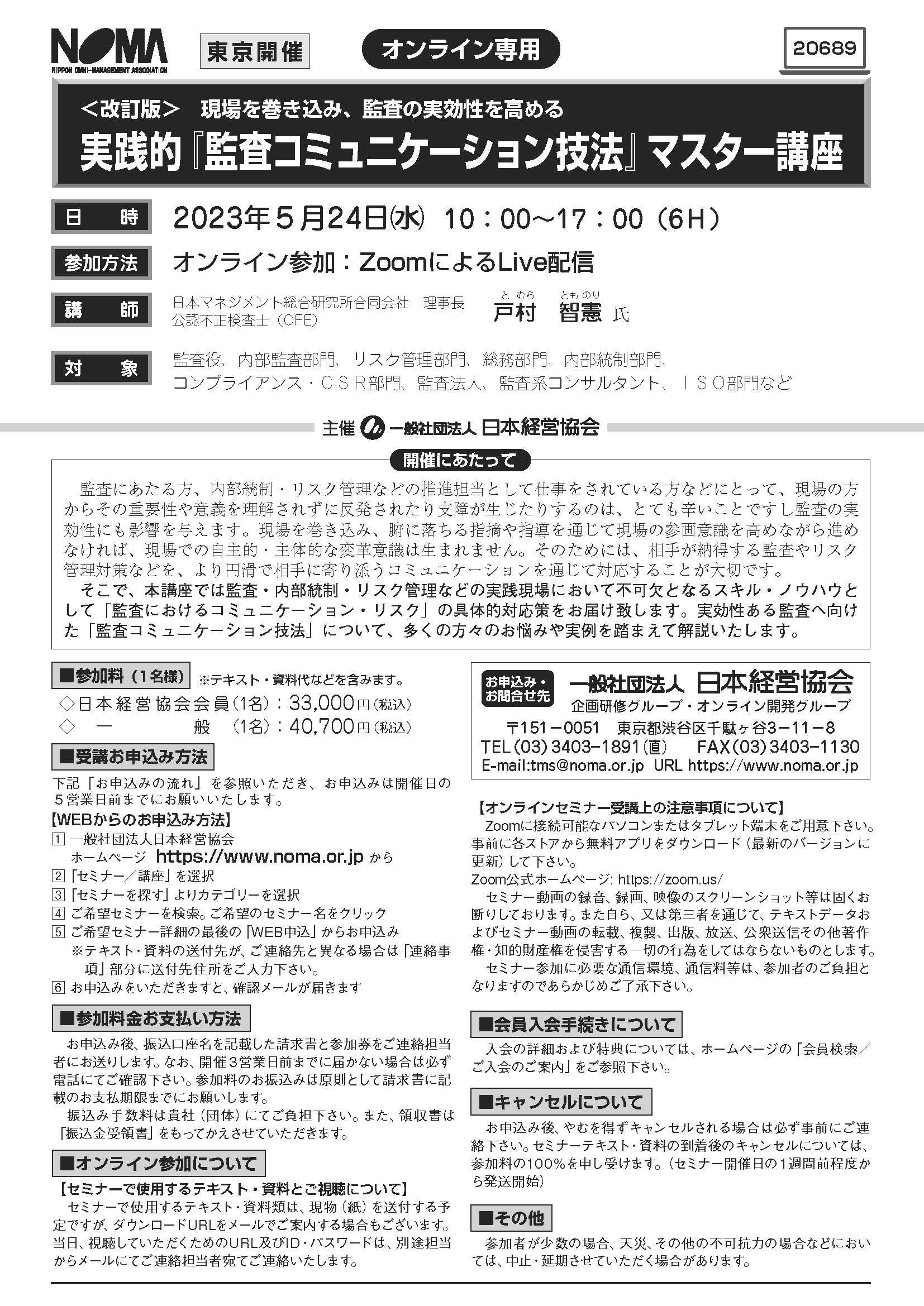 ・講座名: 実践的「監査コミュニケーション技法」マスター講座 ~現場を巻き込み、監査の実効性を高める~