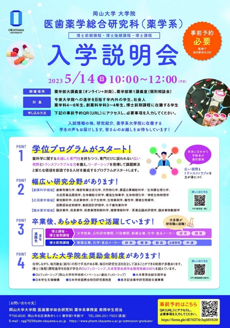 国立大学法人岡山大学(本部:岡山市北区、学長:槇野博史)の大学院医歯薬学総合研究科(薬学系)は、今後大学院への進学を目指す学内外の学生に医歯薬学総合研究科(薬学系)の教育、研究プログラムを広く周知することを目的として、2023年5月14日に入学説明会を開催します。希望があれば薬学系教員との個別相談も実施します。