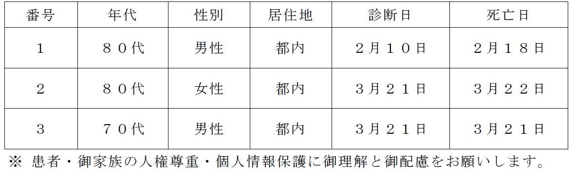 新型コロナウイルスに関連した患者の死亡について business Twitter Facebook はてブ Pocket LINE コピー 2023.03.26 この記事は約1分で読めます。 都内で新型コロナウイルスに感染した方が死亡されましたのでお知らせします。 お亡くなりになった方のご冥福をお祈り申し上げます。 1 新型コロナウイルスに関連した死亡者(本日公表分) 2 新型コロナウイルスに関連した死亡者の累計 8,051人