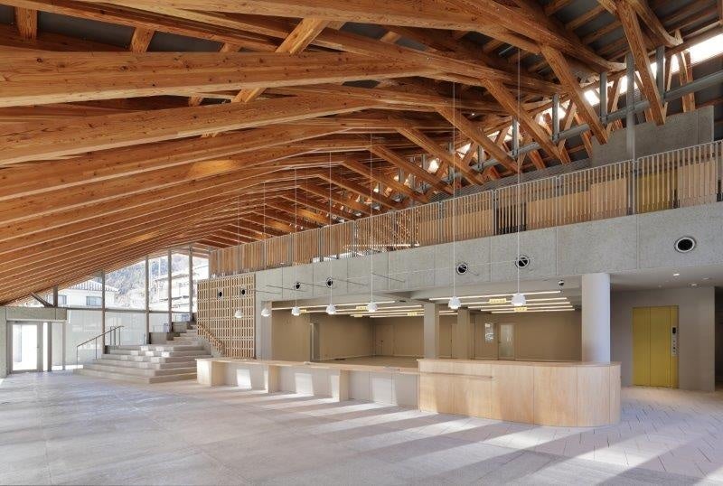 新庁舎は、鉄筋コンクリート造、鉄⾻造、⽊造のハイブリッドな構造となっています。鉄筋コンクリートの基壇の上に、鉄⾻の柱梁を建てたあと、⽊造屋根を架構しました。北側法⾯の⼟砂崩れに備え、本⼯事に先⽴って法⾯補強⼯事を⾏なっており、木がもつ温もりある優しい外観の一方で、十分な堅牢性をもっています。新庁舎は役場機能はもちろんのこと、観光拠点としての機能、⼦供たちの遊び場、お年寄りの寄合の場、災害時の拠点、お祭りの舞台など、さまざまな活動の拠点となります。⻘梅街道に沿って設置したテラスはバスの待合スペースとしても活用されます。新庁舎の内外には⾊々なスペースを設置しており、⽤がなくてもふらりと⼈が集まってくる村の方々の家のような庁舎となります。