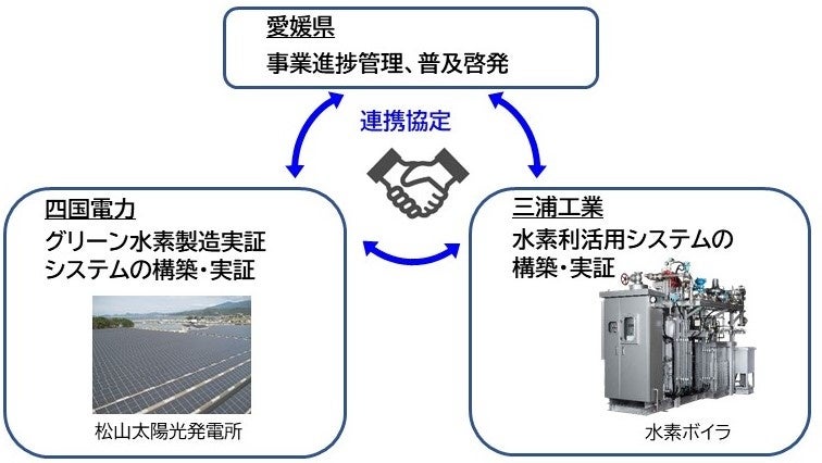 愛媛県、四国電力および三浦工業は、今回の取り組みを機に相互協力することにより、脱炭素社会の実現に向けて、安定的かつ経済的なグリーン水素を活用した水素サプライチェーンモデルの構築を目指してまいります。本実証の内容と各者の役割は以下のとおりです。