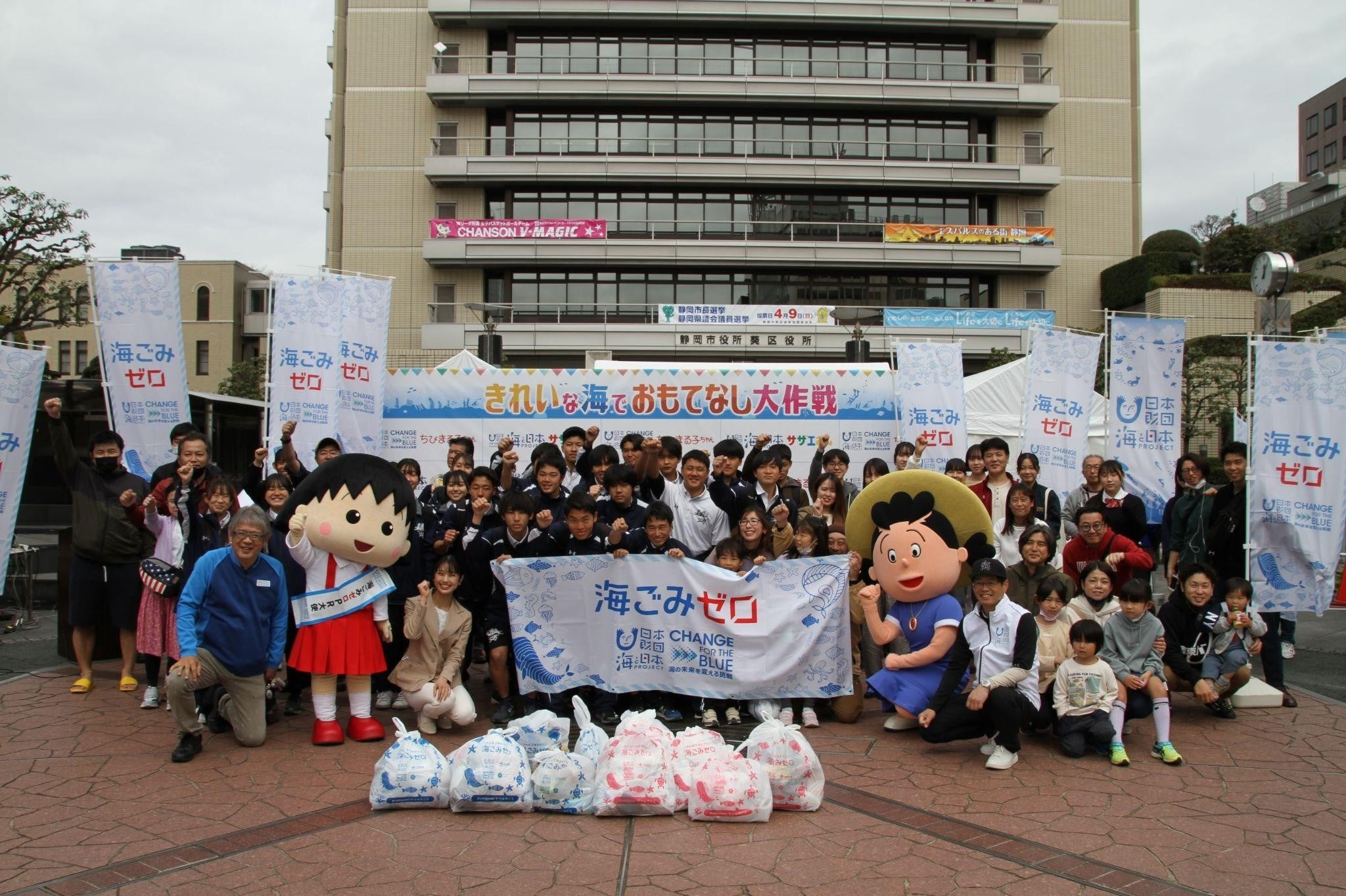 ・開催概要:静岡市の中心地である葵スクエアから青葉シンボルロード、呉服町商店街での自由参加型のごみ拾いイベント。参加者は特典でしずおか海ごみゼロPR大使のちびまる子ちゃん、海と日本プロジェクト特別推進パートナーのサザエさんとの記念写真が撮れる。