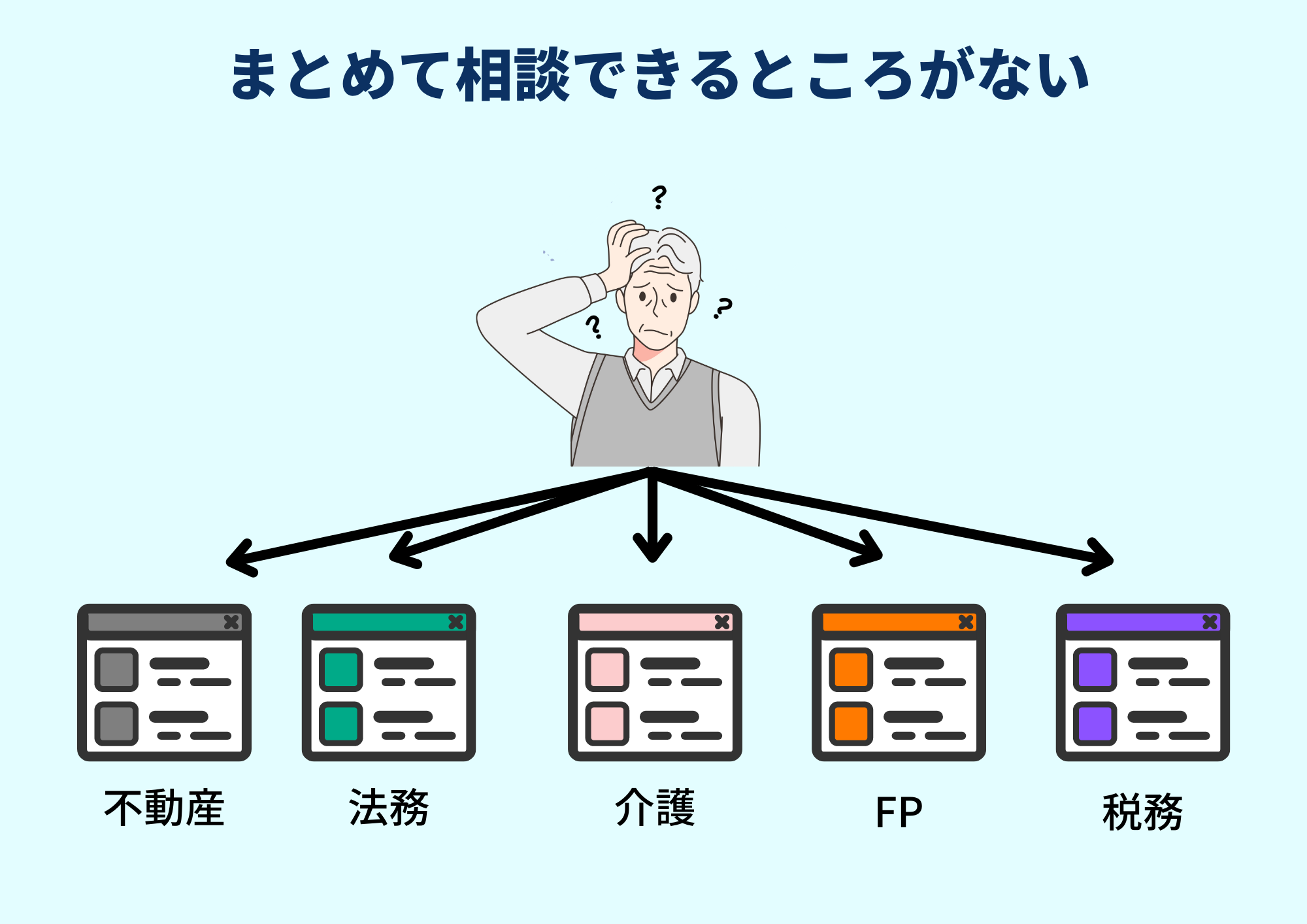 現状のマーケットでは相続終活に関する各種手続きやサービスを検討される際、相続終活における各種士業に法的手続き・不動産・介護・保険・葬儀・墓・遺品整理・相続終活周辺サービスに関して、それぞれの利用される方の相続終活におけるライフステージに合わせ、連続的に他業種を必要なサービスごとに1業種ずつ比較検討の上、専門家選定を行っている現状です。
