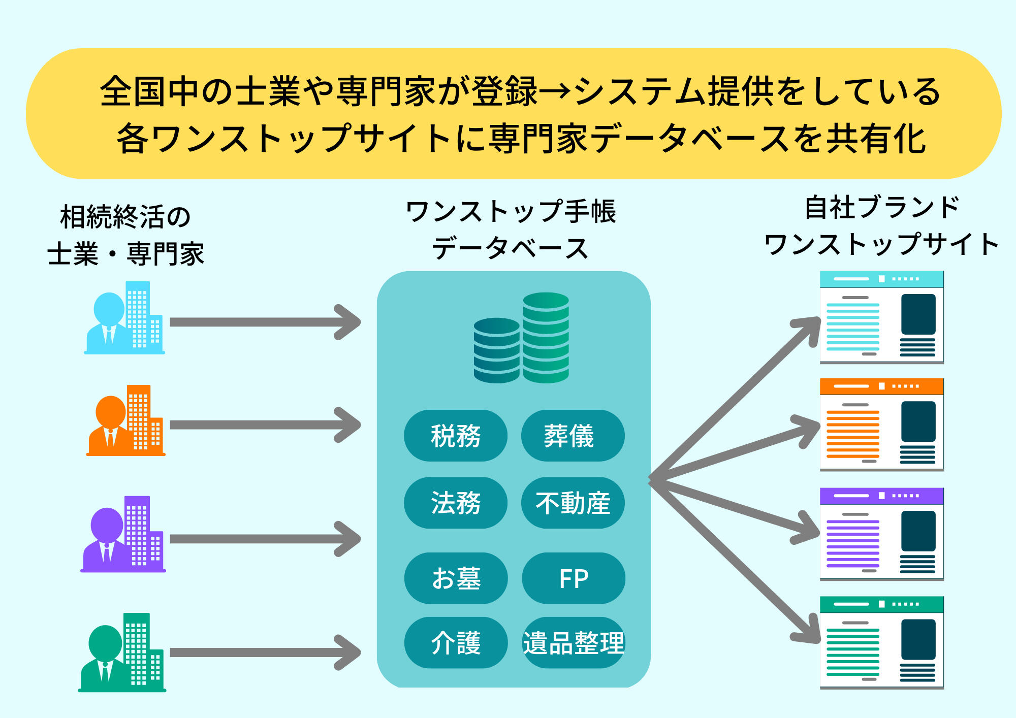 ワンストップ手帳では、業界内の各種専門団体やグループ企業との協力のもと全国の専門家情報を全国約1000社と直接的な契約を行なっており、ワンストップ手帳内の専門家データベースを活用し、ワンストップサイトを運営されたい企業向けに相続終活の診断機能付きワンストップ相談プラットフォームをOEM提供にて行なっております。
