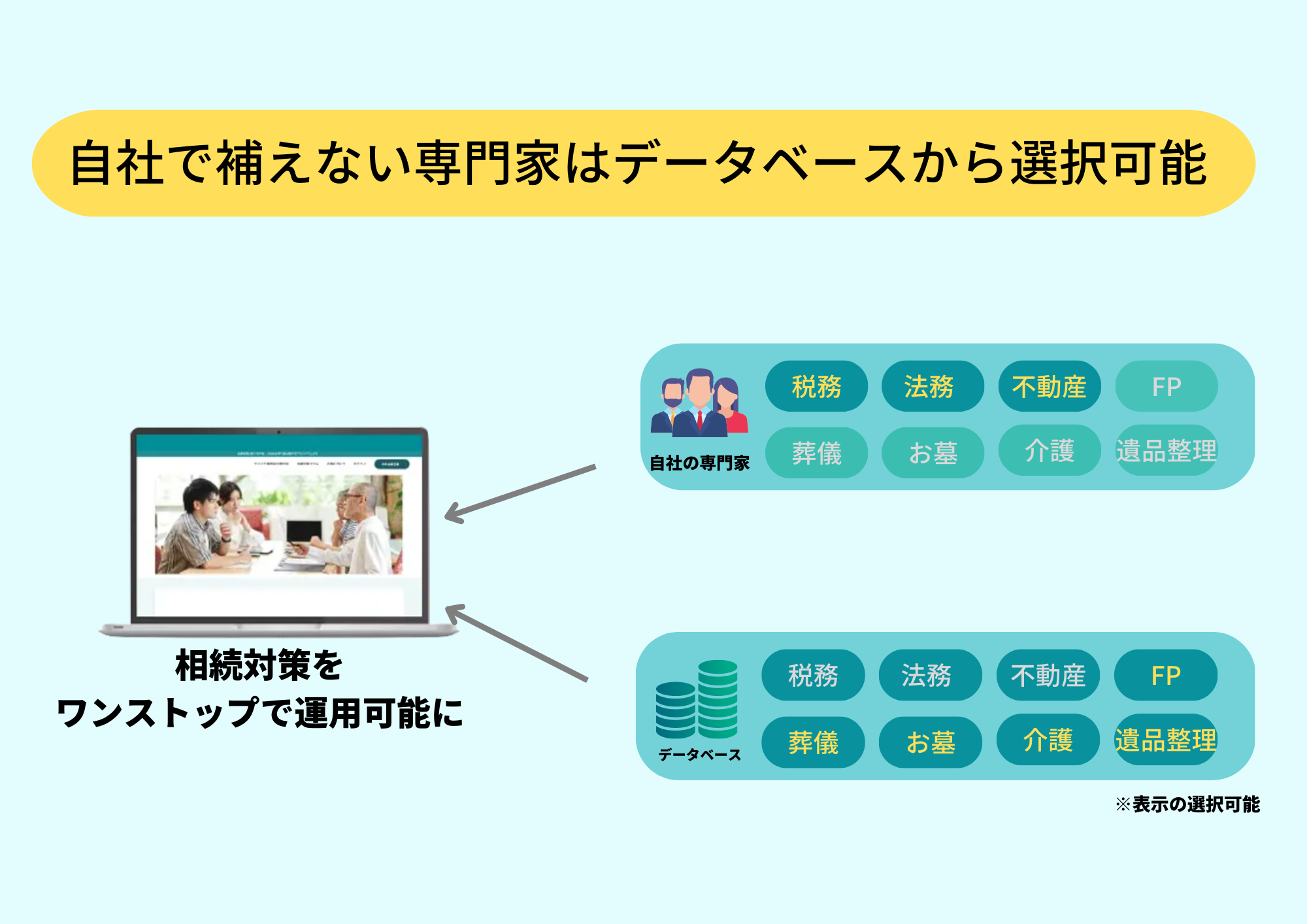 ワンストップ手帳のシステムを導入された企業が、掲載される士業や各種専門家をデータベースからピックアップした上で、相続終活の士業・専門家ネットワークがない場合もシステム導入からすぐに相続終活ワンストップサービスの運営ができる内容となっております。