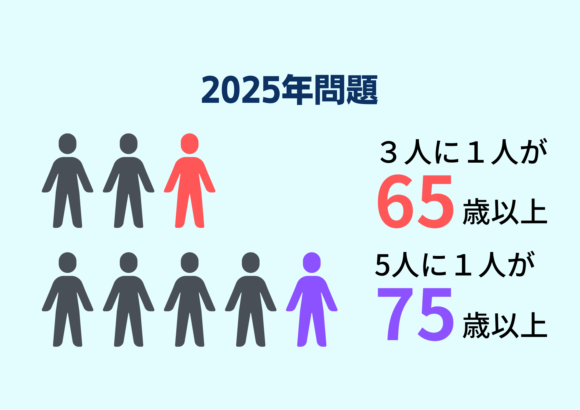 今後加速する超高齢社会における高齢者の比率は日本国内の人口のうち3人〜5人に一人が65歳〜75歳という状況となります。