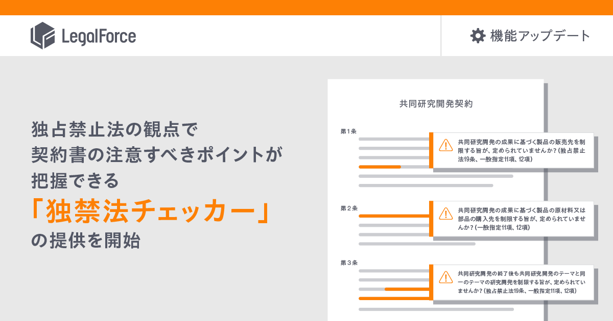 今回、「LegalForce」が「共同研究開発契約」を独禁法の観点から自動レビューできる「独禁法チェッカー」を搭載したことで、法令の規制に違反する可能性がある文言に対し、瞬時に見落としの発見が可能になります。これにより、契約審査時に、独禁法に抵触するおそれがないかどうかの確認に要していた情報収集の労力や時間の軽減をサポートします。