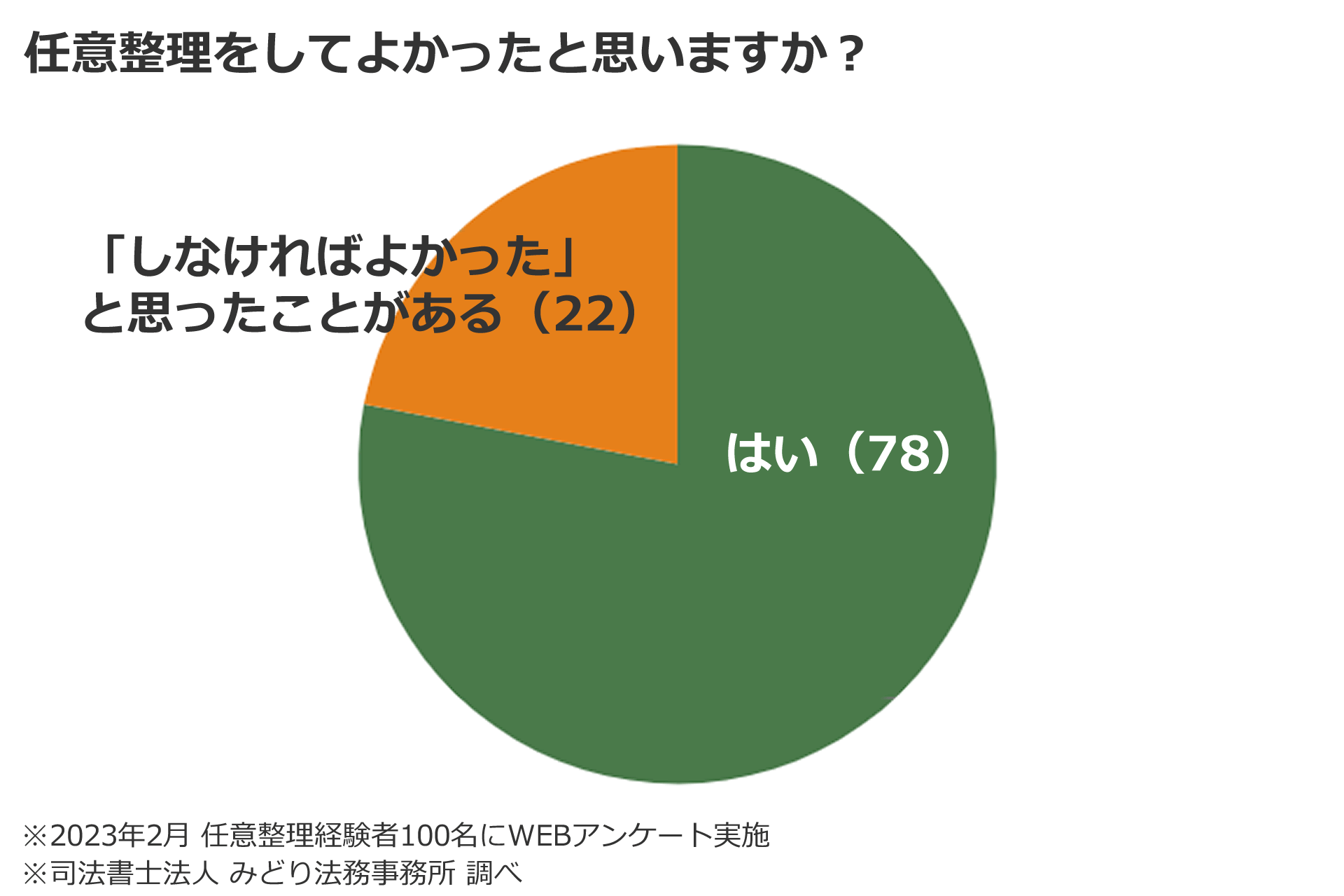 毎月の返済額を減らし、利息や手数料の支払いから解放され、8割近い方が「よかった」と感じる一方、手続き後のデメリットに直面すると「しなければよかった」と感じる方もいるようです。