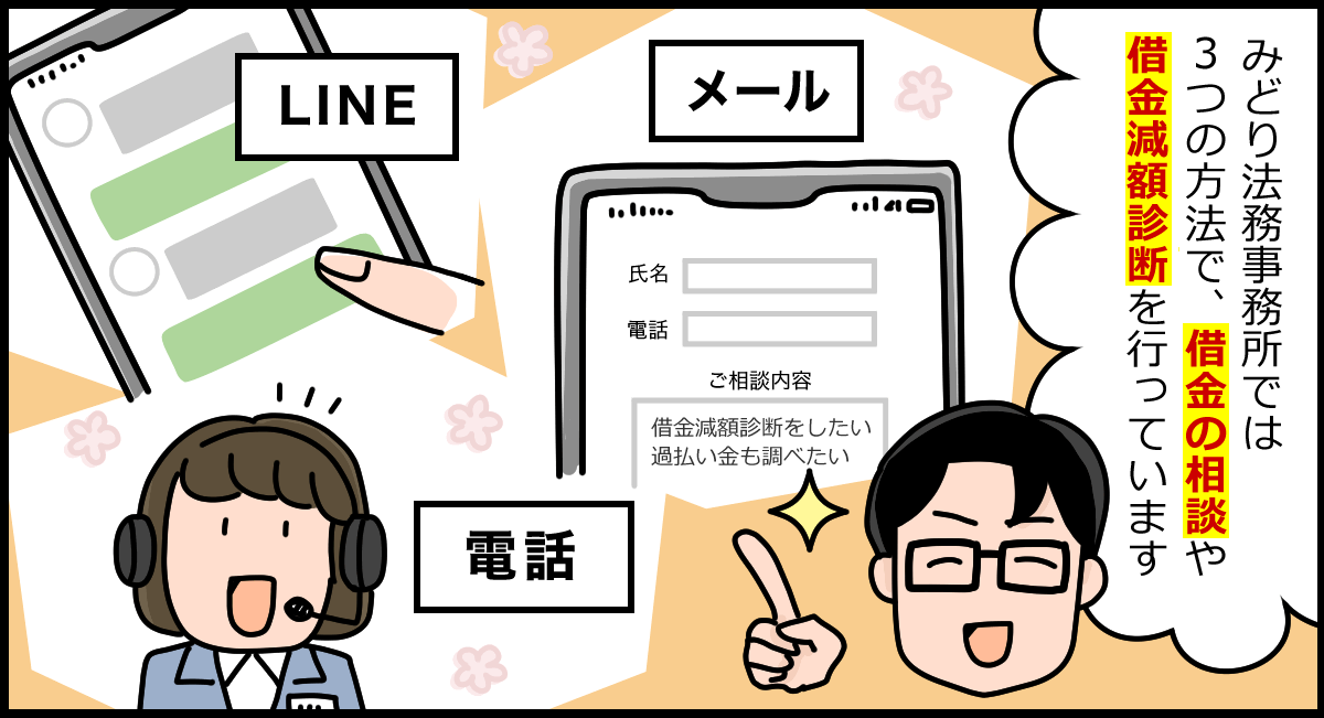 司法書士法人 みどり法務事務所では、借金返済にお悩みの方へ向けてLINEやメール、電話での【借金減額診断・相談】を実施しています。