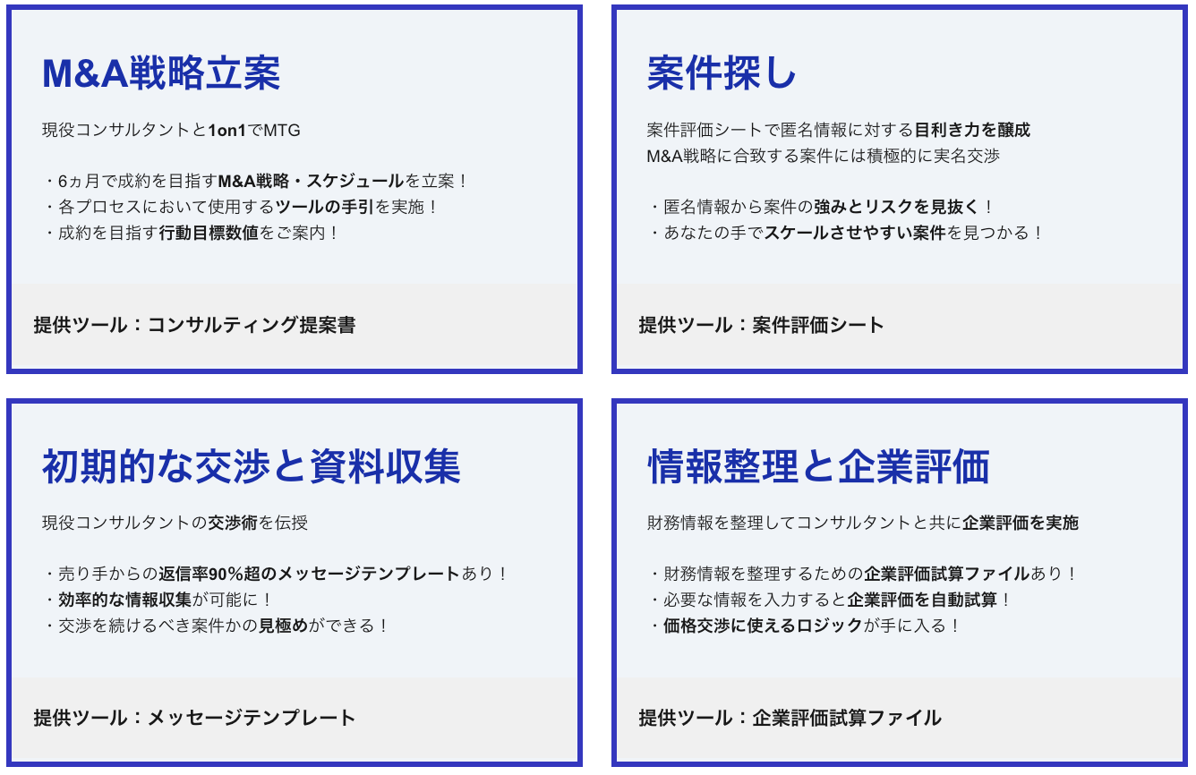 専門的な知見やディールマネジメントノウハウの提供はそのままに、資料作成をはじめとした工数のかかる作業を個人の買い手自ら行っていただくことで、ご利用いただきやすい価格でのフルサポートを実現しました。