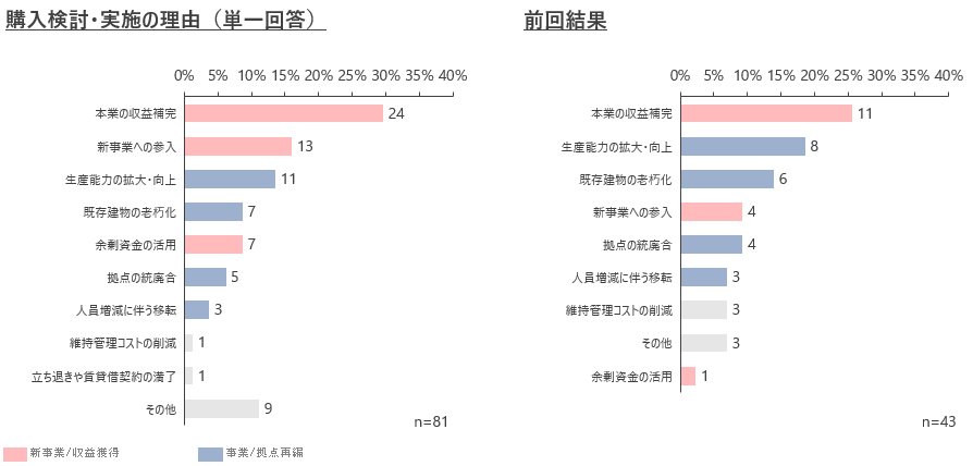 不動産購入理由は「本業収益補完」、「新事業参入」、「生産能力拡大・向上」で全体の59%