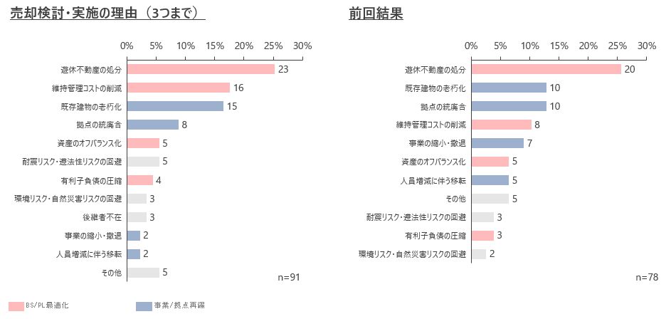 不動産売却理由は「遊休不動産処分」、「維持管理コスト削減」、「建物老朽化」で全体の59%