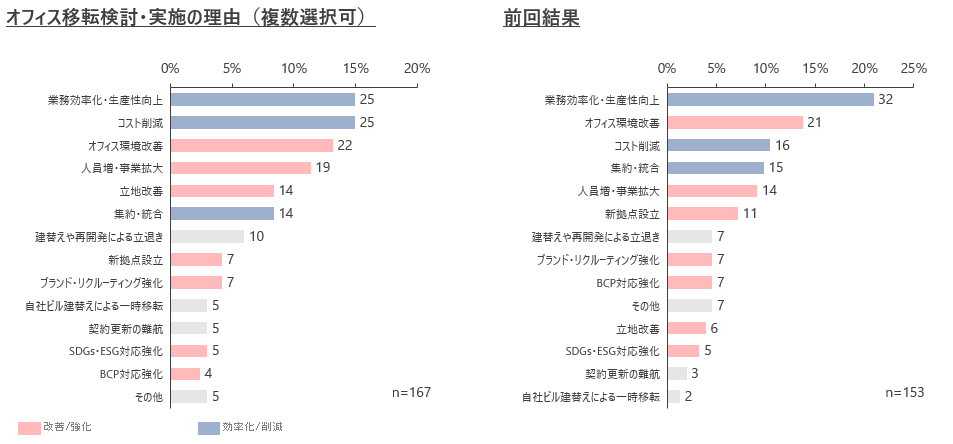 オフィス移転理由は「業務効率化・生産性向上」、「コスト削減」、「オフィス環境改善」で全体の43%