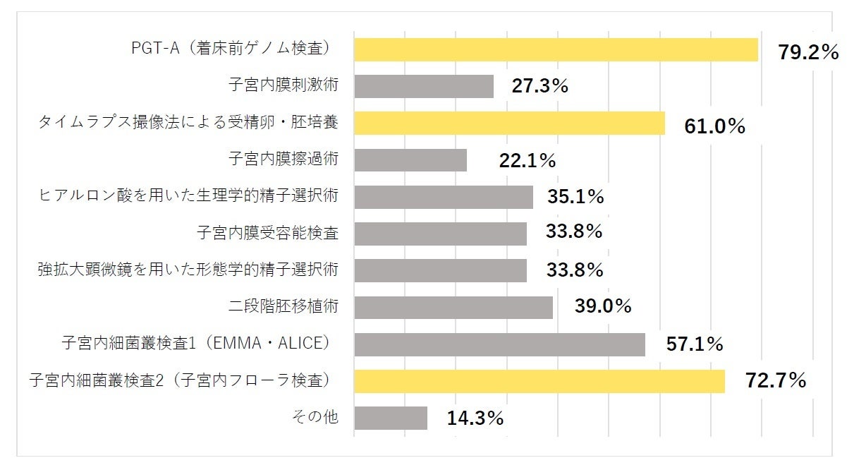 最も多かったのは、体外受精で胚(受精卵)の移植前に染色体異常を調べ、流産率を低下させる「PGT-A[着床前ゲノム検査](79.2%)」でした。ついで、妊娠率や生児獲得率にも関係することがわかってきている子宮内の菌環境を調べる検査「子宮内細菌叢検査2[子宮内フローラ検査](72.7%)」、胚を培養器に内蔵されたカメラによって観察し、胚の情報を移植や凍結する胚を選ぶ際の参考にする「タイムラプス撮像法による受精卵・胚培養(61.0%)」となりました。いずれも厚生労働省より先進医療に認定されている医療技術です。