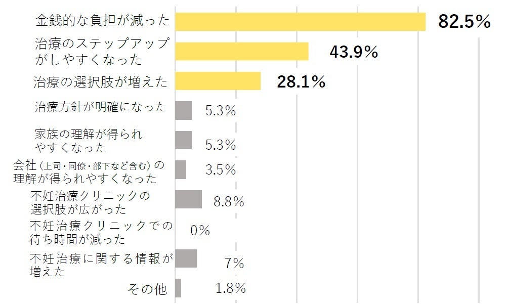 不妊治療の保険適用範囲拡大により、約7割の方が良い影響があったと回答しました。また、良い影響としては、「金銭的な負担が減った(82.5%)」、「治療のステップアップがしやすくなった(43.9%)」、「治療の選択肢が増えた(28.1%)」の順となりました。