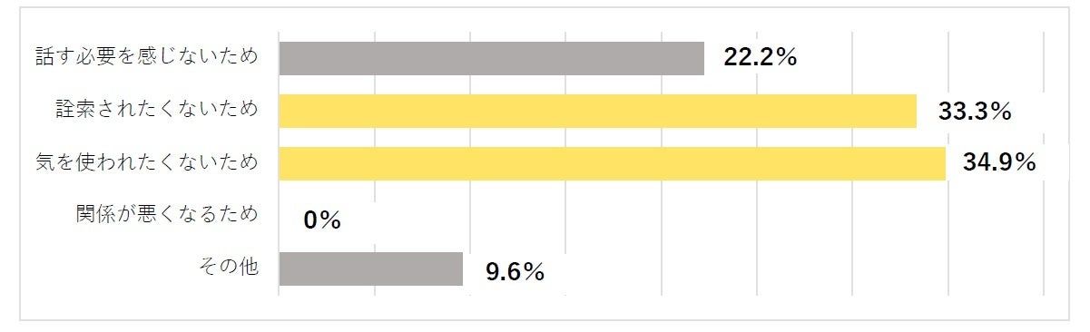 両親や友人、勤め先にも話さない理由は「気を使われたくない」「詮索されたくない」がほぼ同率で上位に