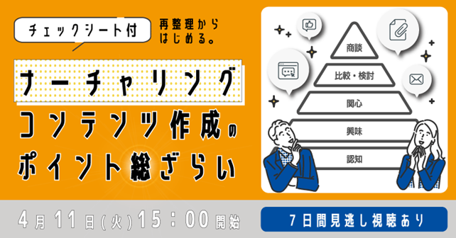 【チェックシート付】再整理からはじめる。ナーチャリングコンテンツ作成のポイント総ざらい 新年度に向けて、ナーチャリング施策に取り組みたいかたはぜひご参加ください。 |