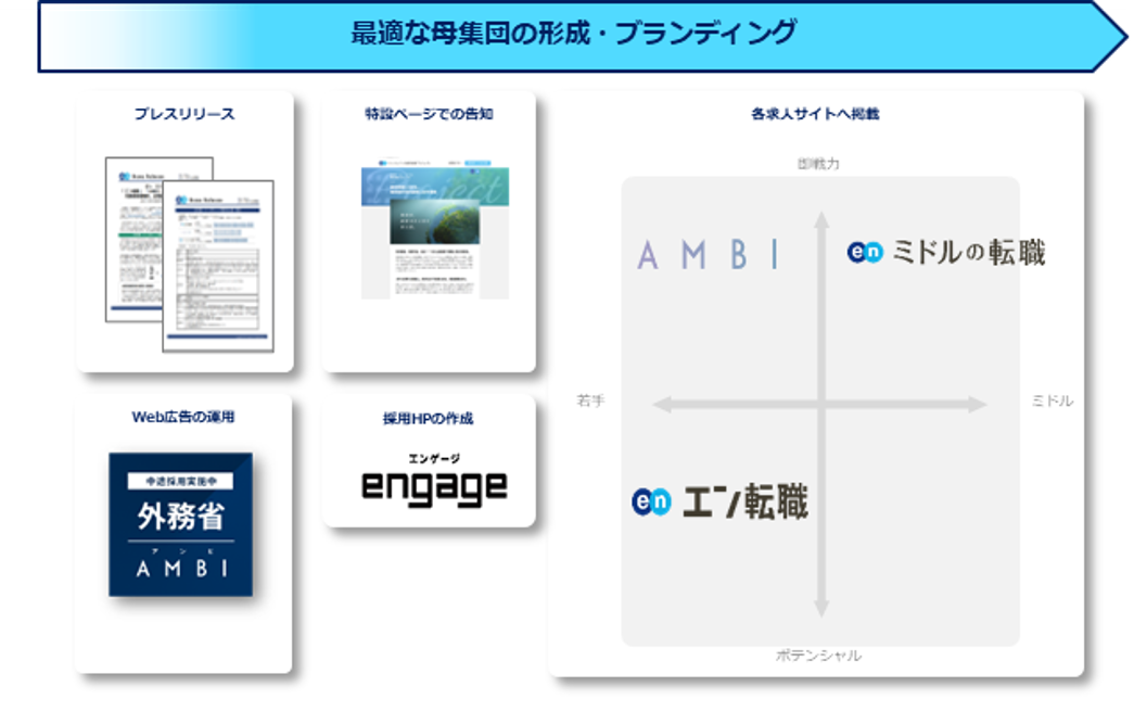 プレスリリースや特設ページ、採用HPの作成、Web広告での告知に加え、各求人サイトでの集客サポートを実施。『エン転職』『AMBI』『ミドルの転職』とターゲットの異なる求人サイトを活用することで、ターゲットへ網羅的に求人を届けました。