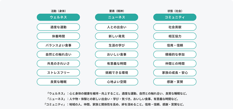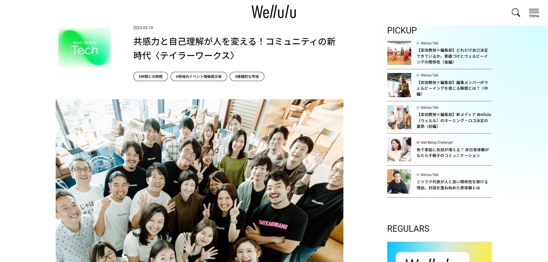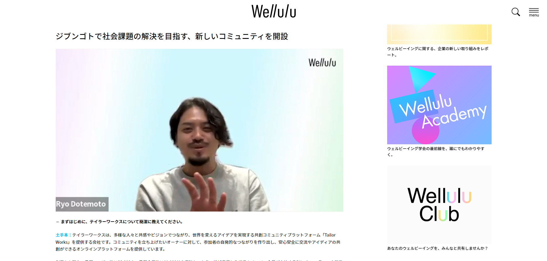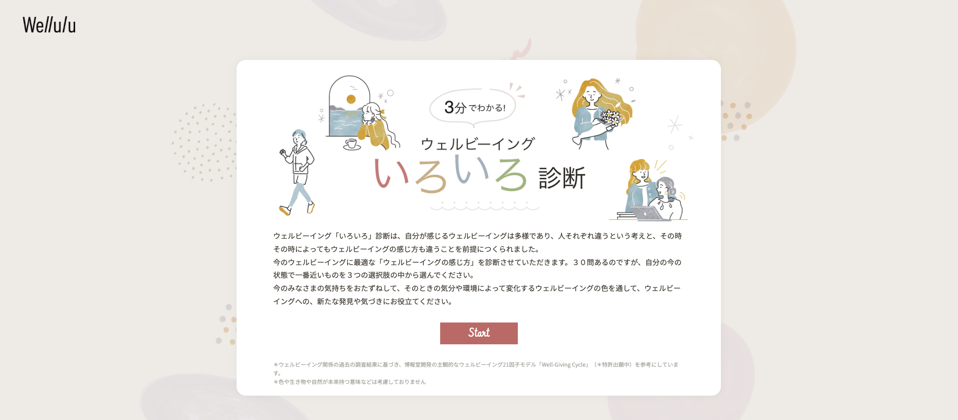本日よりサービス提供を開始した『Wellulu』は、「ウェルビーイング21因子(※)」を活用した診断コンテンツや、適度な運動や睡眠、新しい出会いやコミュニティに関するサービス・商品など、多様な生活者のウェルビーイングを促進する幅広い関連情報を紹介するWebサイトです。