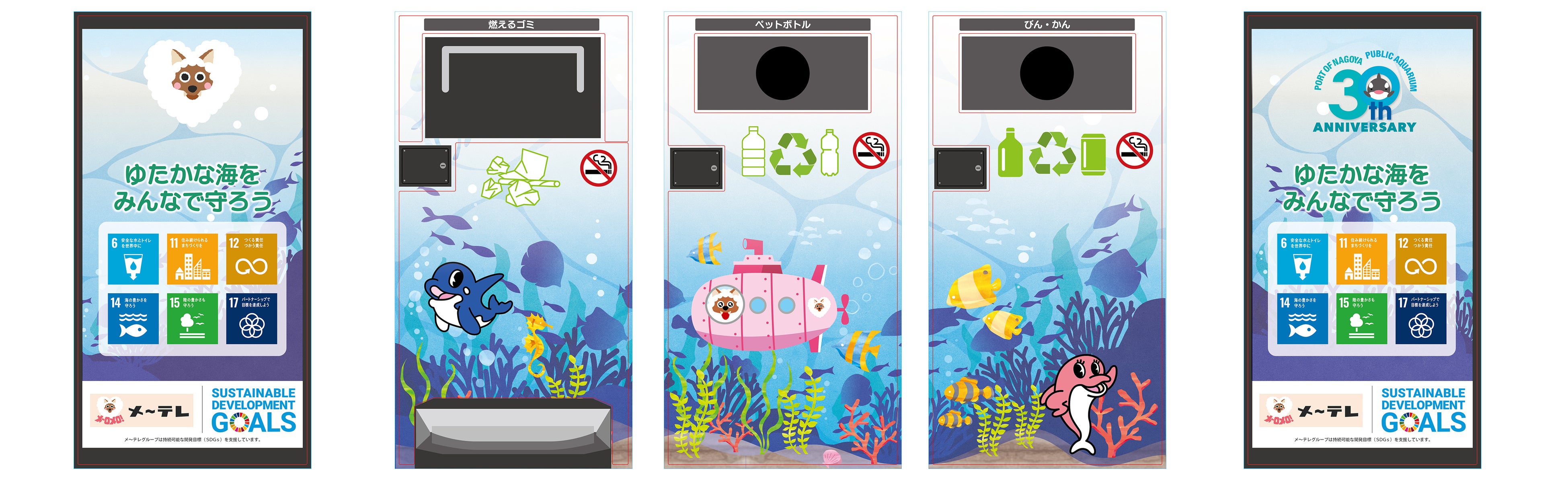 今回のラッピングデザインでは、開局60周年を迎えたメ~テレ(名古屋テレビ放送)と、開館30周年を記念する名古屋港水族館がコラボレーションしています。メ〜テレの局キャラクター「ウルフィ」と、名古屋港水族館のキャラクター「カイオー」「バンディ」たちが海の仲間たちと楽しく遊ぶ様子がデザインされ、子供たちにゆたかな海の大切さを伝えます。