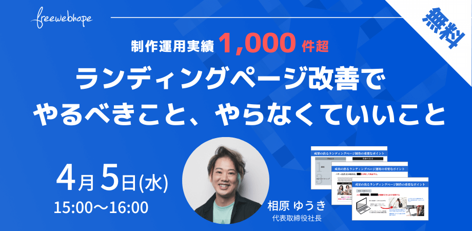 株式会社free web hope(本社:東京都中央区、代表取締役:相原ゆうき)は、無料のオンラインセミナー「制作運用実績1,000件超 ランディングページ改善でやるべきこと、やらなくていいこと」を4月5日(水)に開催いたします。(申し込みフォーム:https://share.hsforms.com/1Fs-eYjx9TyONGGX3PijRdw5fwo5)