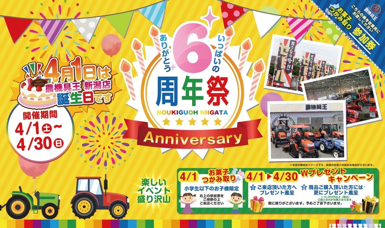 農機具王新潟店では、2023年4月1日から4月30日まで、6周年祭を開催いたします。これまでの感謝の気持ちを込め、期間中にご来店いただいたお客様にはプレゼントをご用意しております。また、1万円(税込)以上の商品をご購入いただいたお客様には、さらに特別なプレゼントを進呈いたします。(※数に限りがございます)加えて、4 月 1 日限定で小学生以下のお子さまに「お菓子のつかみ取り」をご用意しています。普段は大人だけで来店されるという方もお子さまやお孫さんとご一緒にお楽しみいただけるイベントです。このイベントが、お子さまが農業機械に興味を持つきっかけになればと考えています。