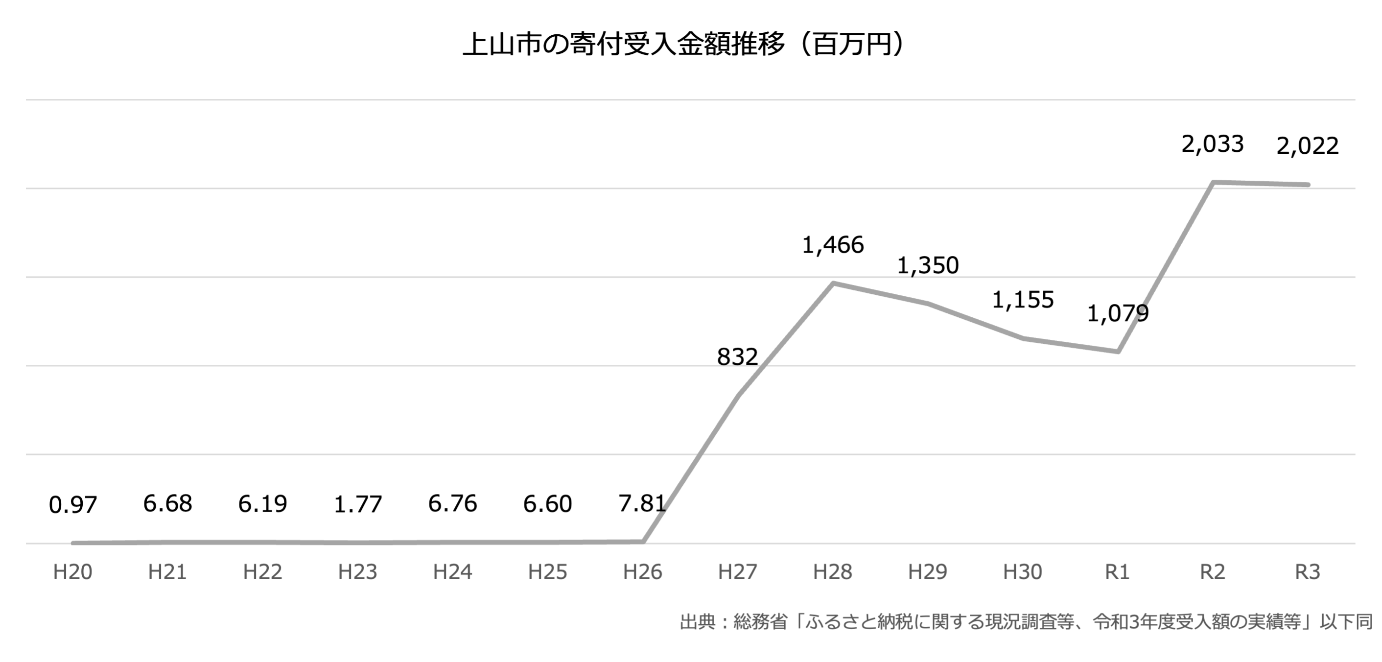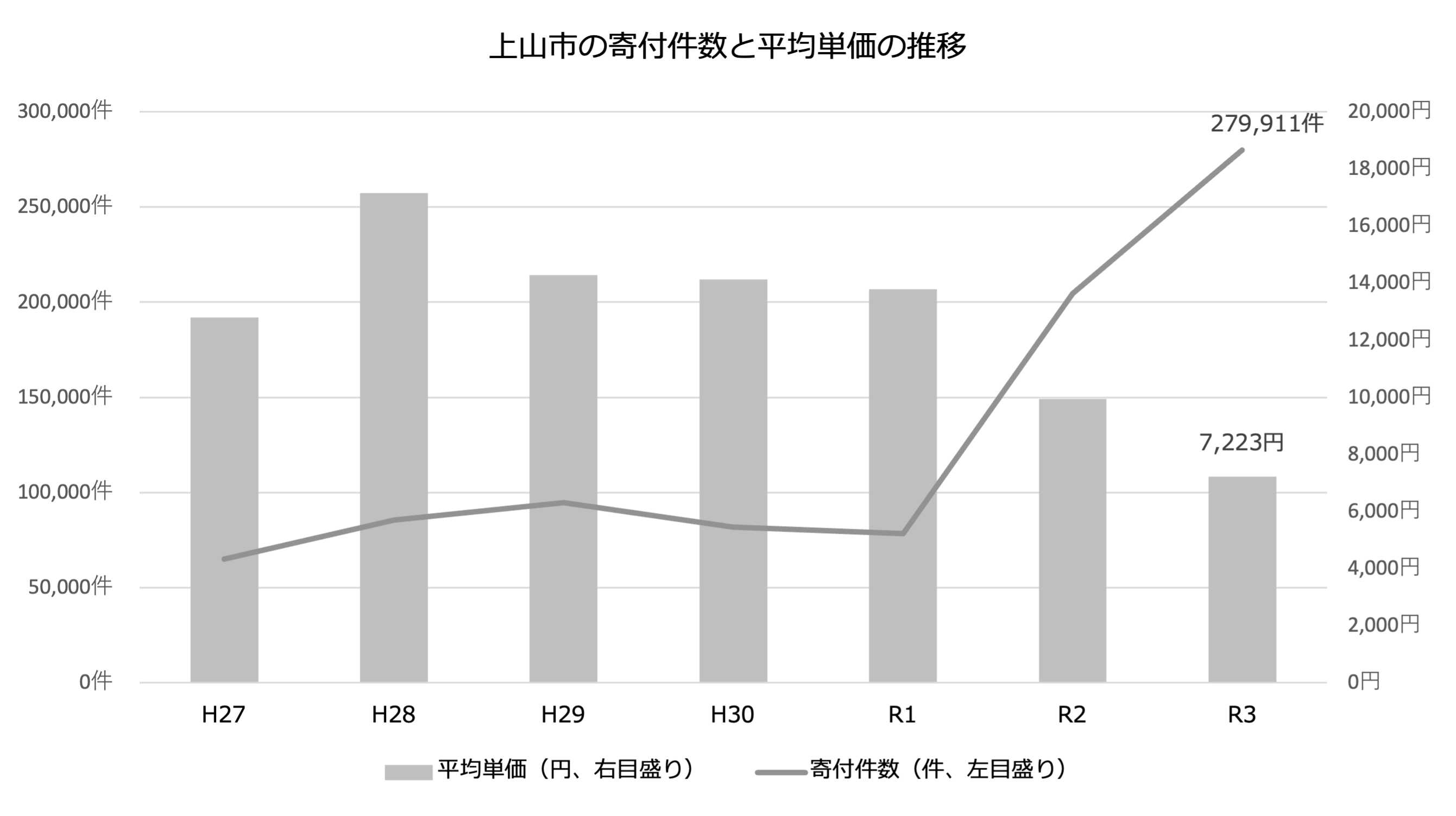 上山市のふるさと納税は寄付拡大傾向にあります。お陰さまで2年連続で20億円を超えることができました。令和3年は霜の被害により主力のさくらんぼが提供できず寄付額が伸びませんでしたが、令和4年は12月末時点ですでに25.5億円と、今年度は大幅な伸びが期待できます。理由としては、通年に渡り提供できる返礼品が増えたことに加え定期便のヒットも後押しになり、4月から6月にかけて前年対比2倍で推移したことが寄付増加への大きな要因です。