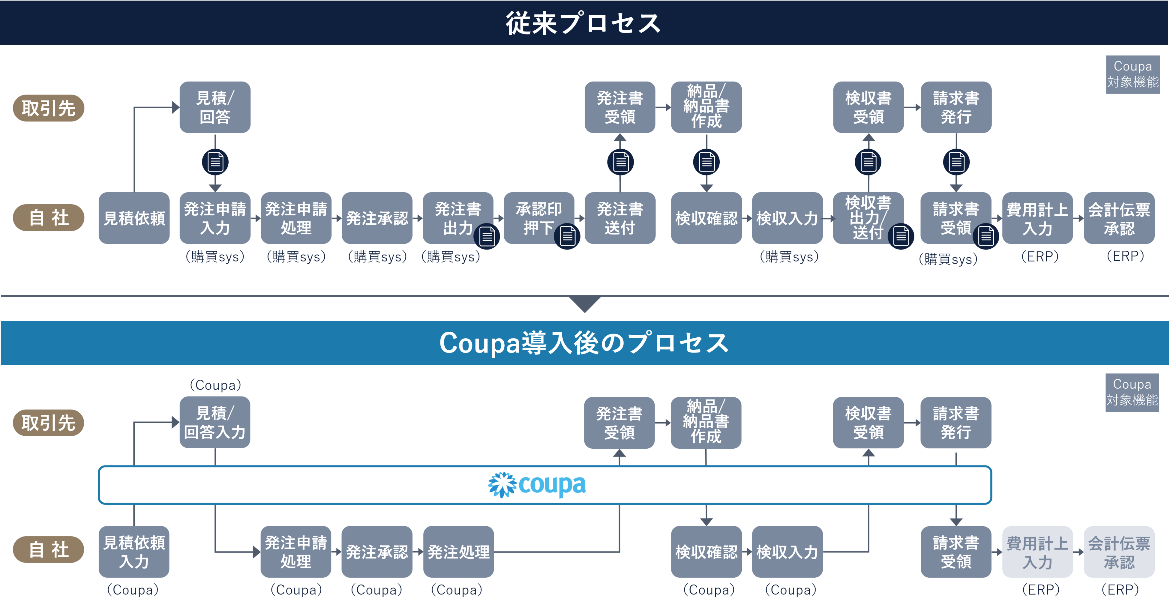 プロセス・オーケストレーションのアプローチと、Coupaを組み合わせることで、サプライヤーも含めたデータの一元管理が可能となり、調達から支払い、財務管理に至るまであらゆる支出とそのプロセスの可視化、最適化を推進します。