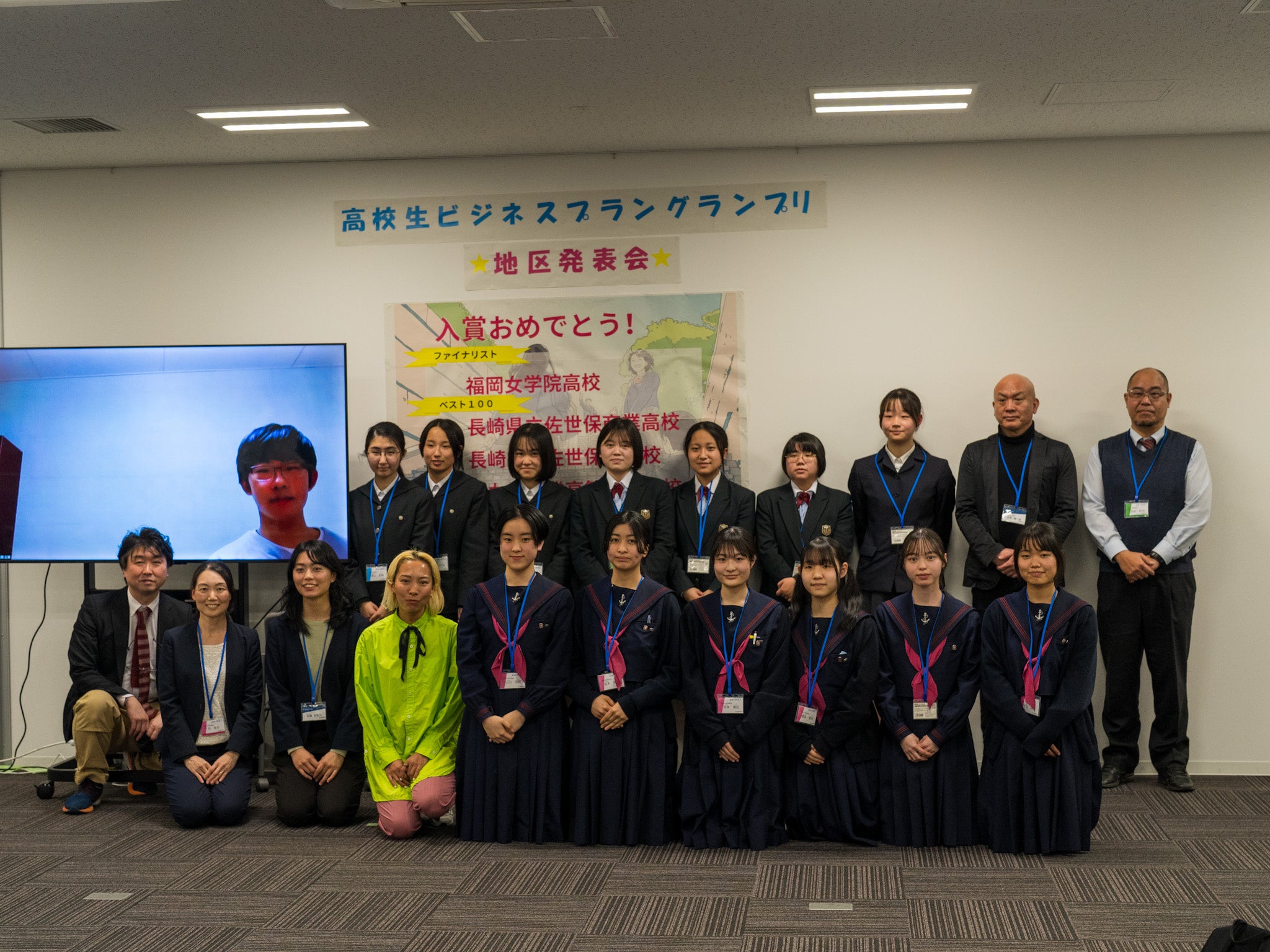 北九州地区発表会(2023年3月17日開催)では、全国599校の応募の中からベスト100位に入賞した、長崎県立佐世保商業高校、北九州工業高等専門学校、長崎県立佐世保北高校、岩田高校、そしてファイナリストの福岡女学院高校のビジネスプランの発表会が行われました。