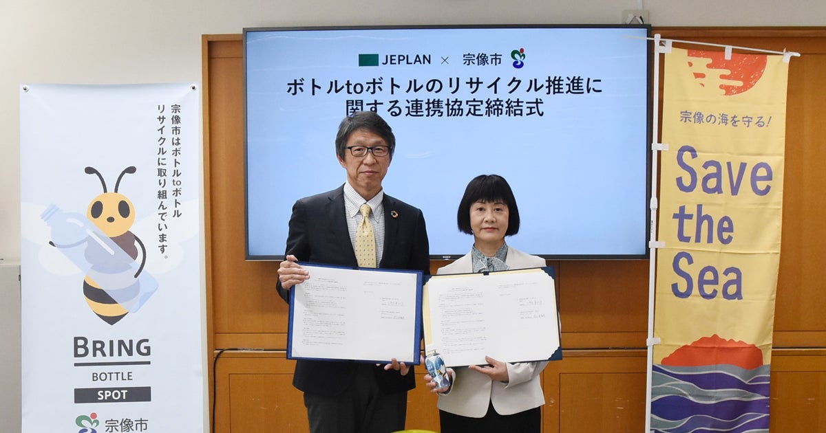 株式会社JEPLAN(代表取締役 執行役員社長:髙尾 正樹、以下「JEPLAN」)は、福岡県宗像市(市長:伊豆 美沙子)と持続可能な循環型社会の実現を目指すことを目的として、ペットボトルの「ボトルtoボトルのリサイクル推進」に関する連携協定を締結しましたので、お知らせいたします。