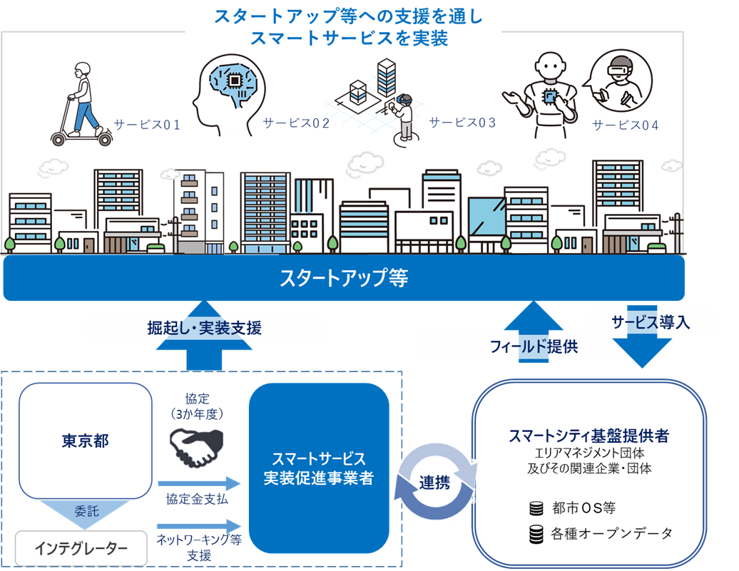このたび、都内全域をフィールドに、スタートアップによるスマートサービス(※)の実装を促進し、都民に利便性を実感いただくことを目指し、都と連携してスタートアップを支援する「スマートサービス実装促進事業者」(3者)を公募します。