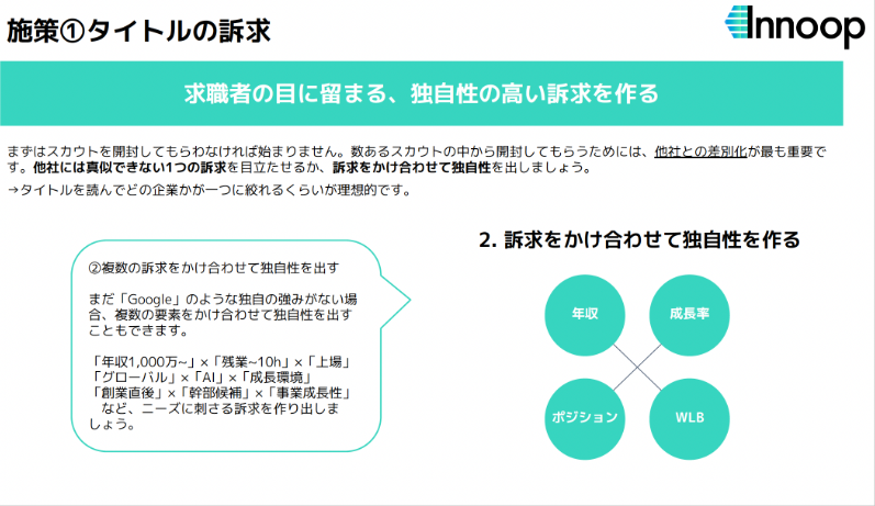 そこで今回、50社以上のスカウト採用を支援しており、過去にはスカウト応募数を18倍に引き上げた実績もあるイノープ株式会社が、実際に試してみて効果があった施策を限定公開いたします。