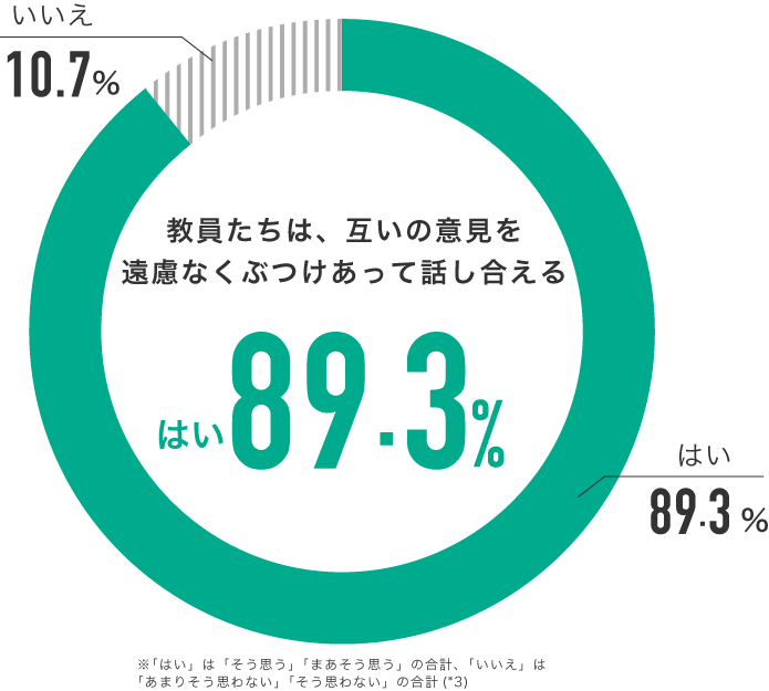 - 「教員たちは、互いの意見を遠慮なくぶつけあって話し合える」とルールメイキングに関わった先生の約89%が回答