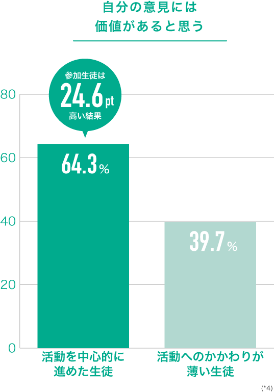 ルールメイキング活動を中心的に進めた生徒と活動へのかかわりが薄い生徒との比較調査を実施。中心的にルールメイキングを進めた生徒の64.3%が「自分の意見には価値があると思う」と回答し、それ以外の生徒と比べて24.6ポイント高い結果となりました。(*4)