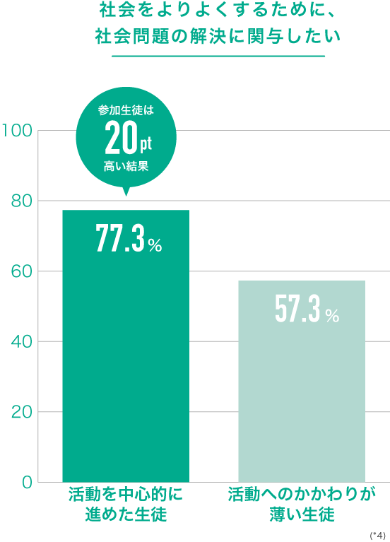 ルールメイキング活動を中心的に進めた生徒と活動へのかかわりが薄い生徒との比較調査を実施。中心的にルールメイキングを進めた生徒の77.3%が「社会をよりよくするために、社会問題の解決に関与したい」と回答し、それ以外の生徒と比べて20ポイント高い結果となりました。(*4)