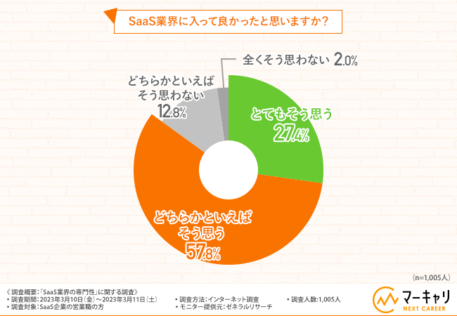最後に、「SaaS業界に入って良かったと思いますか?」と質問したところ、『どちらかといえばそう思う(57.8%)』 と回答した方が最も多く、次いで『とてもそう思う(27.4%)』『どちらかといえばそう思わない(12.8%)』『全くそう思わない(2.0%)』 と続きました。