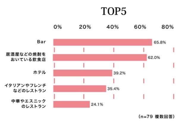 本格焼酎と泡盛を飲むシーンは、居酒屋や郷土料理店からバーへと広がりを見せています。僅差ですがトップにあがったのは「バー」。長らく食中酒としてローカルな飲み方が定着してきましたが、ウィスキーやジンのように食前や食後に単体で楽しむ蒸留酒としての役割も酒蔵の人たちが認識するようになったことを表しています。またイタリアンやフレンチ、中華料理やエスニックなど、和食以外にも合わせたいという、酒蔵がイメージしているシーンも広がっています。