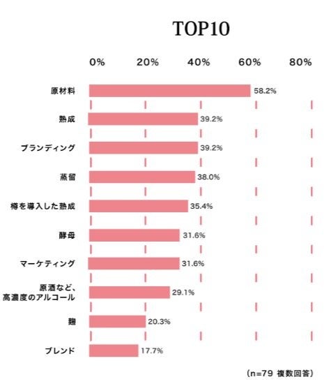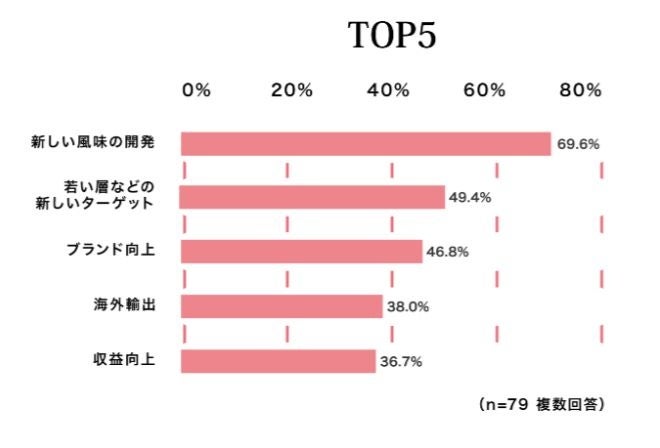 トロピカルでフルーティーな新しい焼酎の風味が注目されたきっかけは、2018年発売の芋焼酎「フラミンゴ」(国分酒造)や「だいやめ」(濵田酒造)。世界的におこっていたクラフトジンブームを背景に、「若い層などの新しいターゲット」をつかむべく、新機軸の商品開発が活況になっている結果に。さらに4割が「ブランド向上」とあげているように、既存の商品からの脱却をはかり、ブランドの価値を築くために新しい味わいを目指している酒蔵が増えていることもうかがえます。