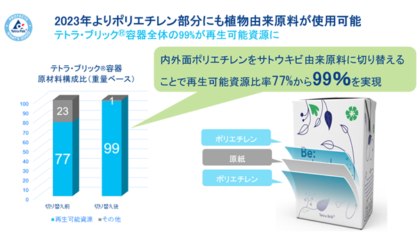 ※2 テトラパックの学乳用テトラ・ブリック®紙容器の包材を全て植物由来のポリエチレンに変更した場合の想定値(当社調べ)。