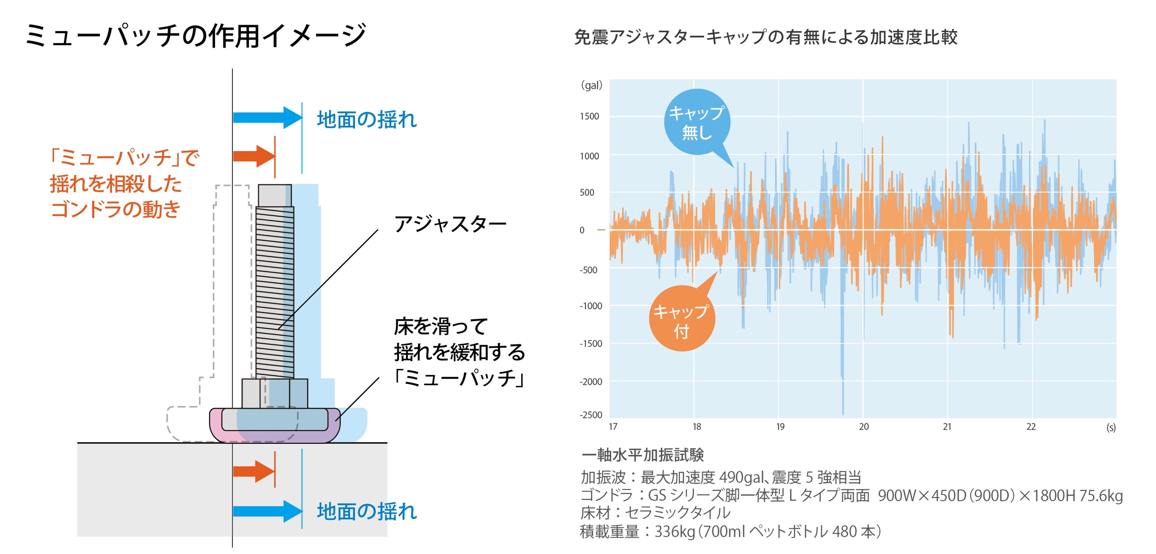 「ミューパッチ」を取り付けることで床面の上をゴンドラが滑り、揺れを伝わりにくくします。