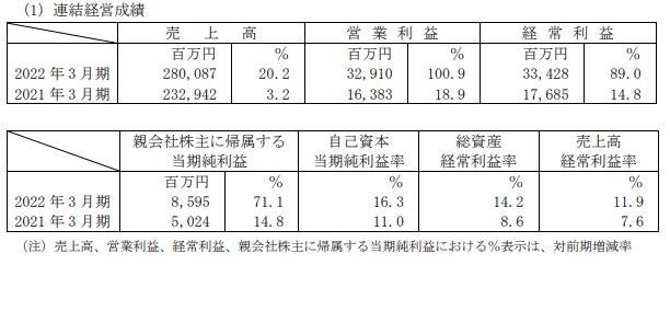 その結果、売上高は 280,087 百万円(前年比 20.2%増)、経常利益は 33,428 百万円(前年比 89.0%増)、 親会社株主に帰属する当期純利益は 8,595 百万円(前年比 71.1%増)となり、売上高、経常利益、純利益は いずれも過去最高を記録しました。