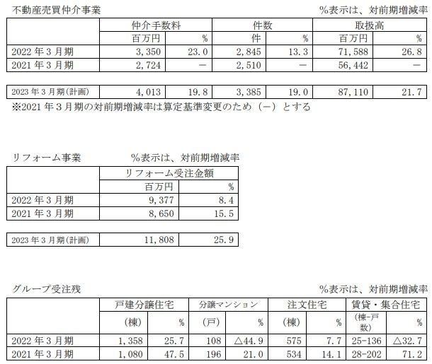 こうした外部環境の下、当社グループは永続発展を図るために日々「進取挑戦」の精神を持ち、仕事に取り組んでまいりました。 主力事業である戸建分譲住宅事業においては、新型コロナウイルス感染症拡大に伴う生活環境の変化が見られるなかで、IT を活用した非接触型の営業活動を拡充してまいりました。また、ウッドショック等による建築費の高騰を受けて企画方針の見直しに取り組み、ユーザー目線の魅力的な間取りと生活提案を強みとした新シリーズを企画しました。プレカット事業においては、木材需要の高まりやコンテナ船物流の停滞により、原材 料の入荷、在庫推移に合わせた生産・販売を行う状況となったものの、木材仕入に注力することで、取引先へ着実に供給し続けることができました。