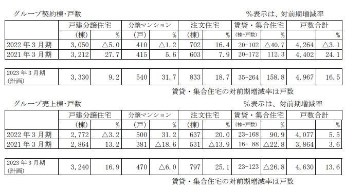 こうした外部環境の下、当社グループは永続発展を図るために日々「進取挑戦」の精神を持ち、仕事に取り組んでまいりました。 主力事業である戸建分譲住宅事業においては、新型コロナウイルス感染症拡大に伴う生活環境の変化が見られるなかで、IT を活用した非接触型の営業活動を拡充してまいりました。また、ウッドショック等による建築費の高騰を受けて企画方針の見直しに取り組み、ユーザー目線の魅力的な間取りと生活提案を強みとした新シリーズを企画しました。プレカット事業においては、木材需要の高まりやコンテナ船物流の停滞により、原材 料の入荷、在庫推移に合わせた生産・販売を行う状況となったものの、木材仕入に注力することで、取引先へ着実に供給し続けることができました。