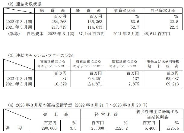 1. 2022年3 月期の連結業績(2021年3月 21 日~2022年3月 20 日)