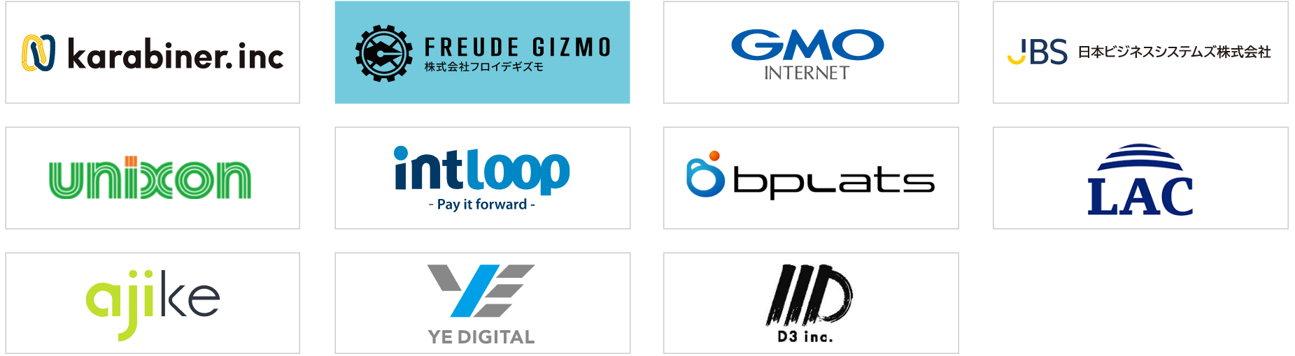 株式会社アジケ、イントループ株式会社、カラビナテクノロジー株式会社、GMOインターネット株式会社、D3株式会社、日本ビジネスシステムズ株式会社、ビープラッツ株式会社、株式会社フロイデギズモ、株式会社ユニゾンシステムズ、株式会社ラック、株式会社YEデジタル