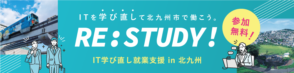 北九州市が主催の「RE:STUDY!IT学び直し就業支援in北九州」とは、社会人を対象とし、IT業界のトレンドや新たなスキルを学び、市内IT企業へ再就職を行うリカレント教育カリキュラムです。
