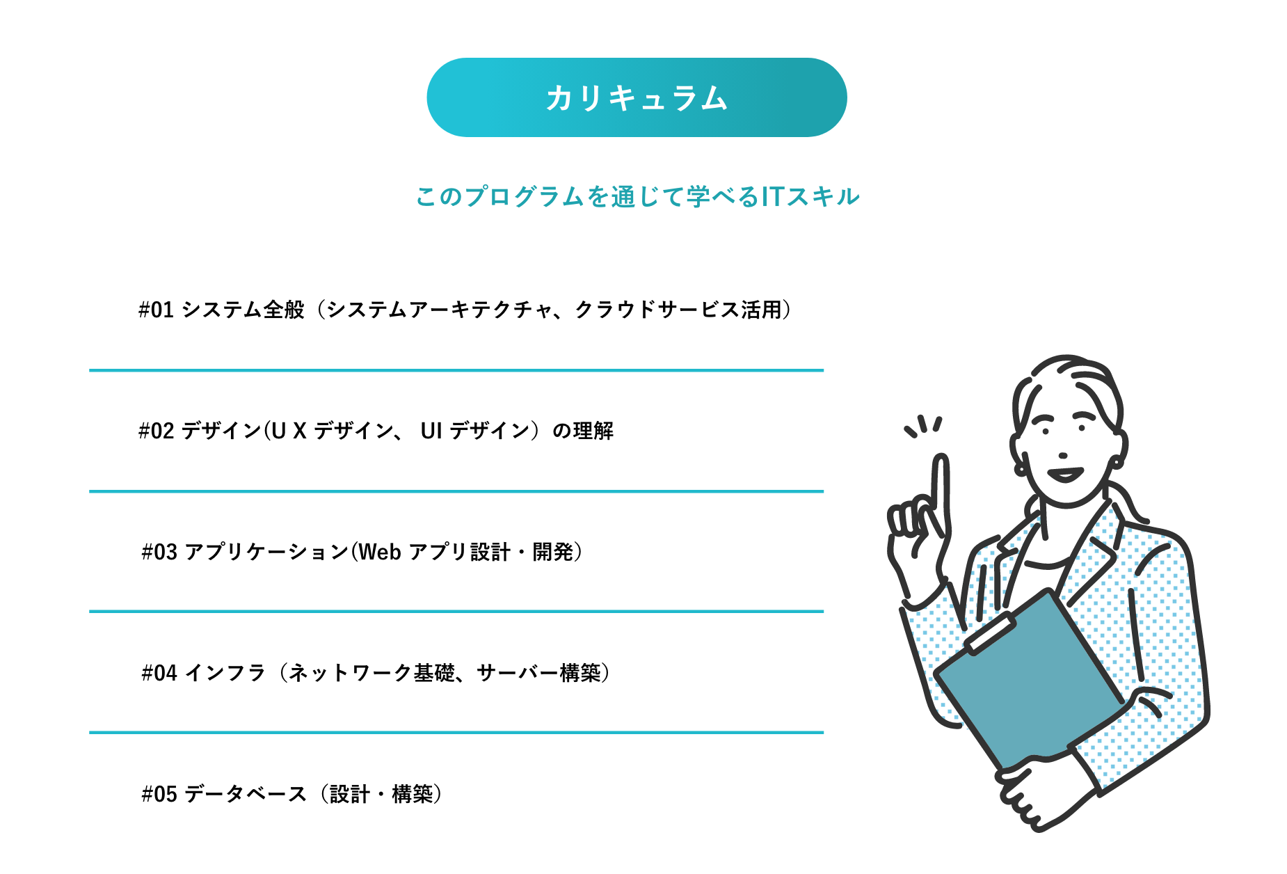 このカリキュラムでは、クラウドサービス基礎、システムの構築、webデザインなど働きながらIT分野のトレンドや最新のスキルを幅広く学ぶことができます。講座の合間には、業界を知るためIT企業との交流会や短期間にサービスを1つ作り上げるハッカソンイベントなど各種イベントも準備しており、一人前のプログラマーとして活躍できるようなカリキュラムとなっております。